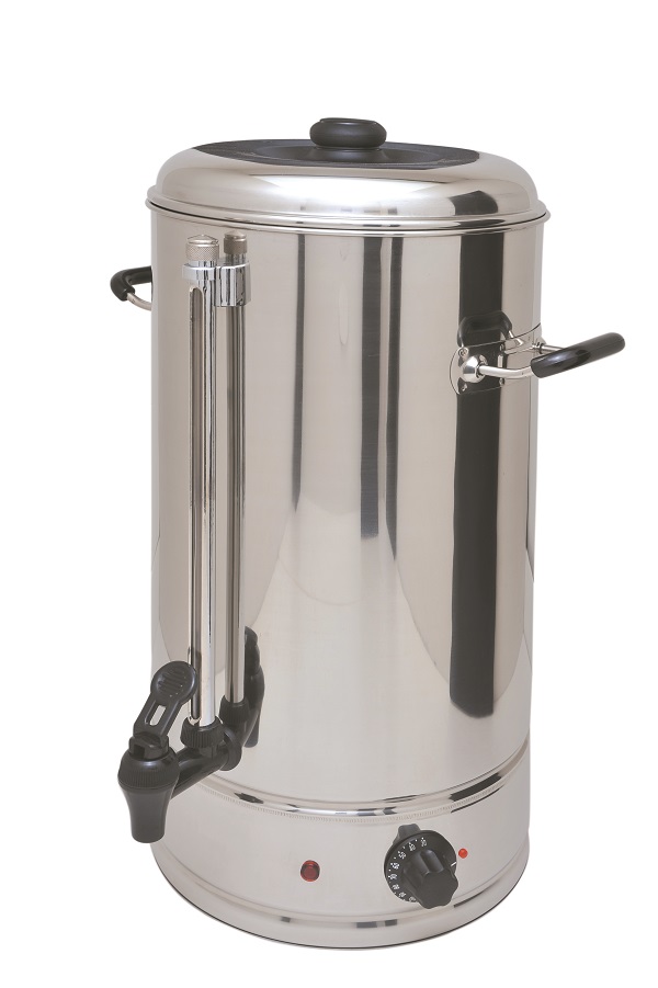 Электрокипятильник заливной, термостат, защита от сухого хода, открытый ТЭН, одинарные стенки, поддержание постоянной температуры, точная регулировка температуры, температурный режим: от 30 до 110 °C, надежный краник, герметичный корпус с защитой от протечек.