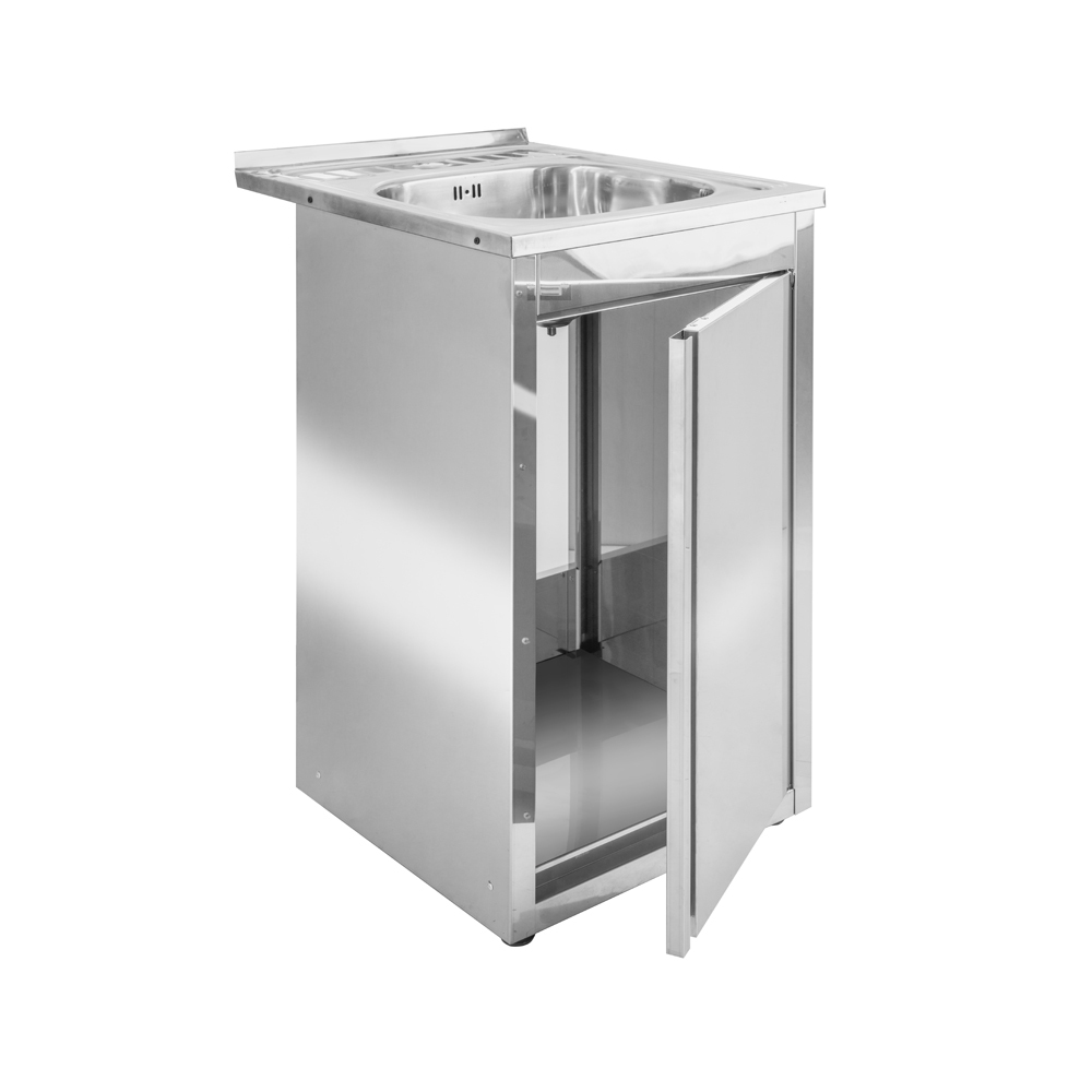 Рукомойник напольный закрытый состоит из цельнотянутой мойки и каркаса. Мойка изготовлена из пищевой нержавеющей стали. Каркас из крашенной/нержавеющей стали. Ножки изделия регулируются по высоте, что позволяет при установке устранять неровности пола. Ванна имеет выпуск под стандартный сифон и отверстие под смеситель.