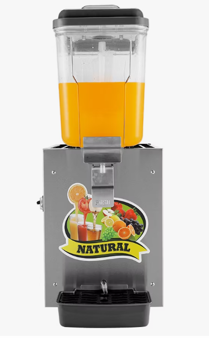 Состоит из прозрачного контейнера для жидкости, в котором и происходит охлаждение за счет холодильного агрегата с компрессором, что находится в корпусе сокоохладителя. 1 резервуар из прозрачного пластика на 16 литров. Мощность: 0,145 кВт. Размер: 265x450x680мм. Вес: 14 кг. Хладагент: R290. Температрурный режим 3-7°С. Материал корпуса: нерж.сталь/пластик.